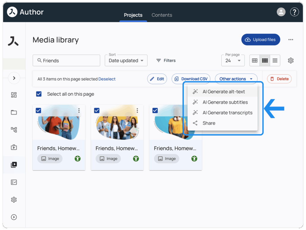 Once automatic metadata generation has been enabled, AI will be used to generate the alternative text for images, subtitles for videos and transcripts for audios and videos upon upload into the media library. In addition to automatically generating metadata when uploading assets, you can select one or more existing assets in the media library and use the new Other actions menu to bulk generate metadata using AI.